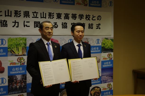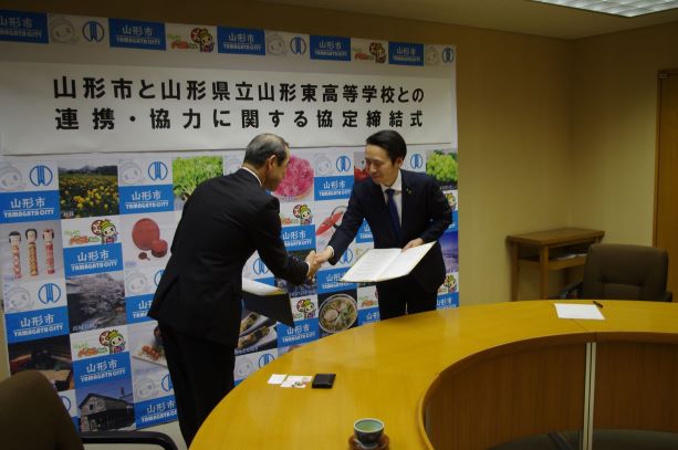 新聞やテレビニュースでも報道がありましたとおり、3月24日(火)「山形市と山形県立山形東高等学校との連携・協力に関する協定」を締結いたしました。山形市にはこれまでも課題研究や探究活動において、様々ご指導やご助言をいただいておりましたが、今後は、今回締結した協定の趣旨を踏まえ、探究型学習を一層推進するとともに、地域と学校が協働して、地域課題を解決するような取組をさらに活発化させたいと思います。